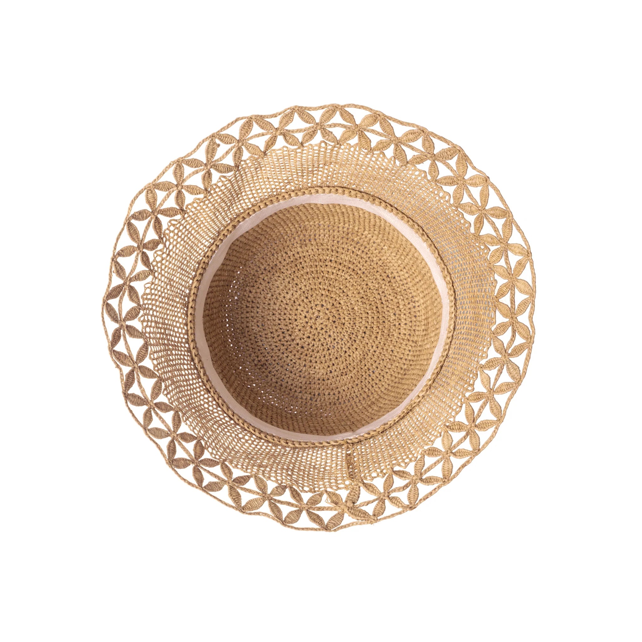 Joined to the crochet crown with no visible seam, BOKETY's brim displays raffia bobbin lace, a technique that is becoming rarer in the face of globalisation.