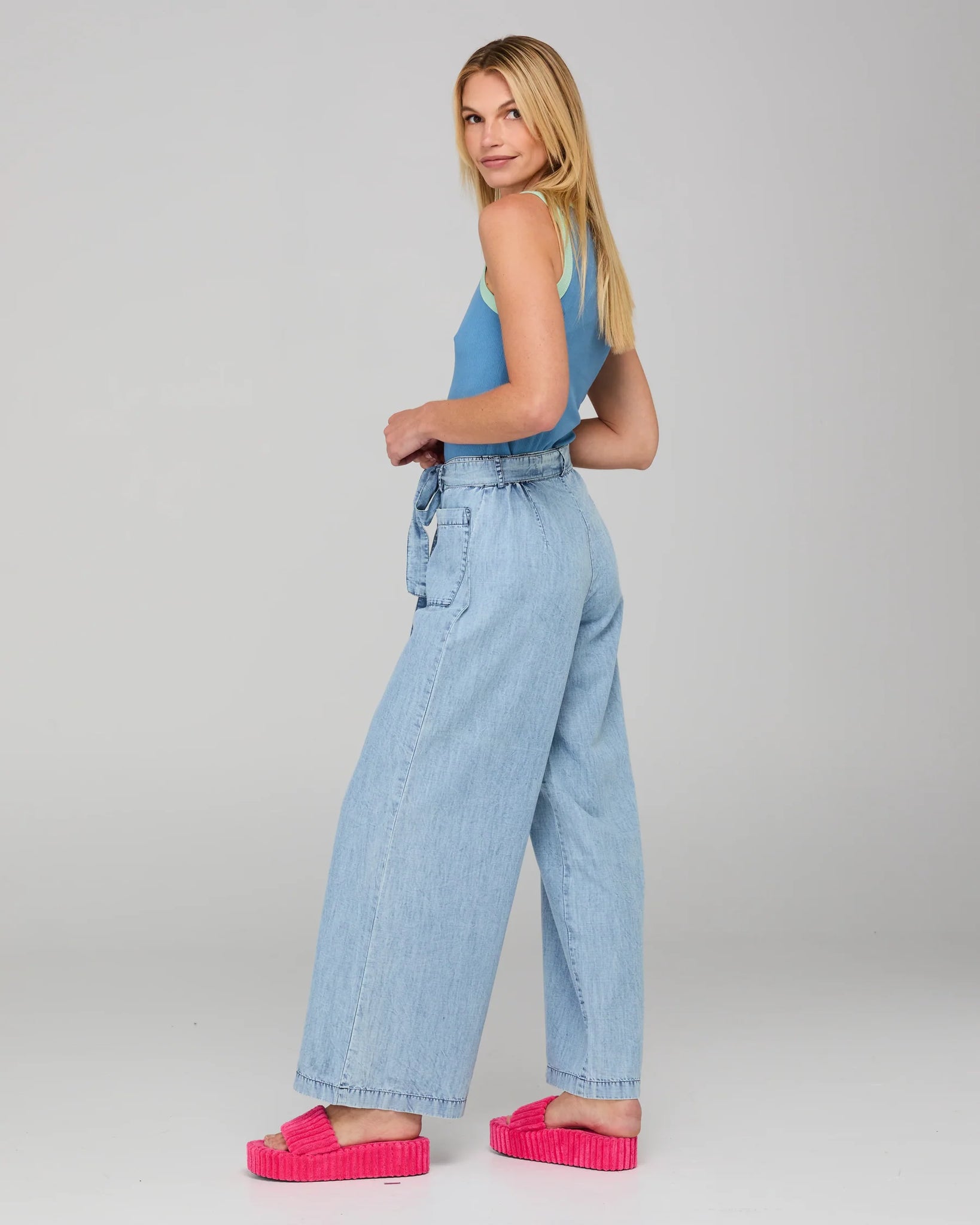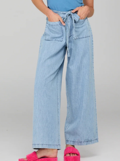 100% lyocell, full length, wide leg, fly front opening with button, front pockets, stone-washed soft fabric, and belt loops.
