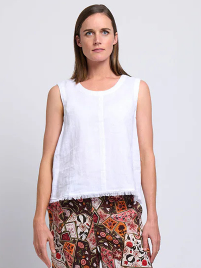 The Fringe Benefits Shell Top in White by Foil is the perfect addition to any wardrobe. Made from a cool, non-stretch linen fabric, it features a soft round neckline and unique fringe detailing on the hemline. This versatile and stylish fringe benefits shell can be worn on its own or layered under a shirt or jacket for a polished look.