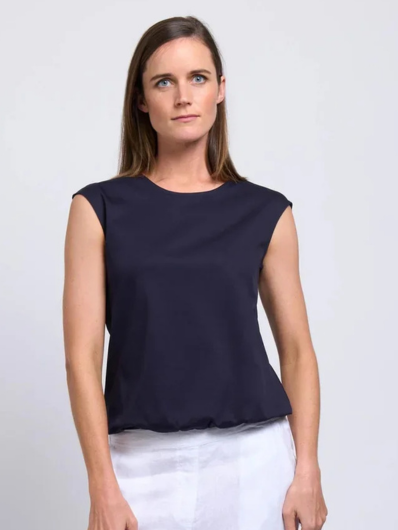 Featuring cap short sleeves and a classic round neckline, this top offers a clean and polished look.