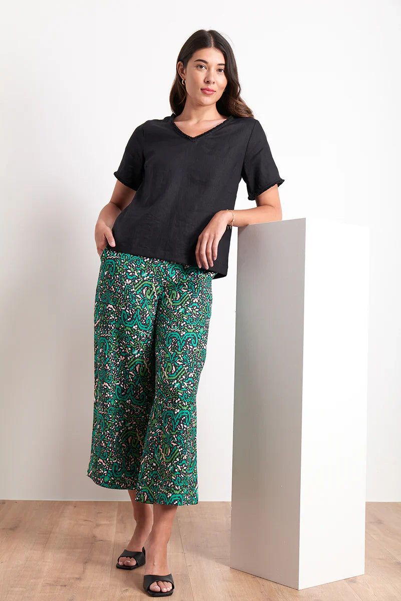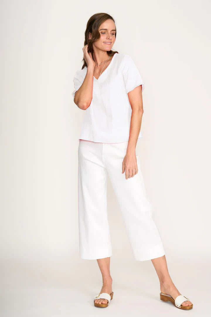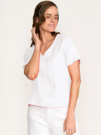 Introducing the V Benefits Top by Foil, a classic linen top with a V-neckline and short sleeves that have a fringe detail.