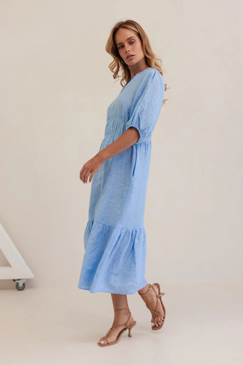 The Linen Gather Detail Dress in Chambray by Kaleido features expertly gathered details that enhance its flattering silhouette.