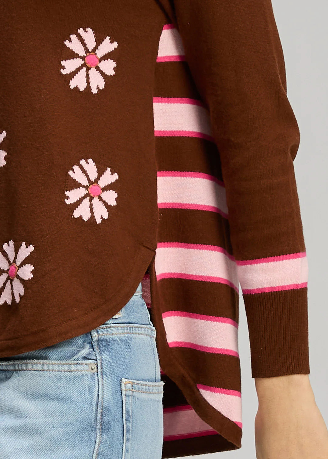 The charming daisy print delivers instant style while a striking striped back panel adds an unexpected design flourish that sets it apart. With its rounded hem and bold contrast detailing, this sweater embodies Zaket & Plover's commitment to thoughtful craftsmanship and artistic flair.