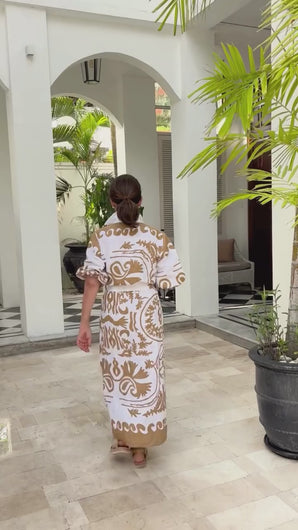 Made from a lightweight linen fabric, it features a striking pecan and white print that stands out while remaining elegant.