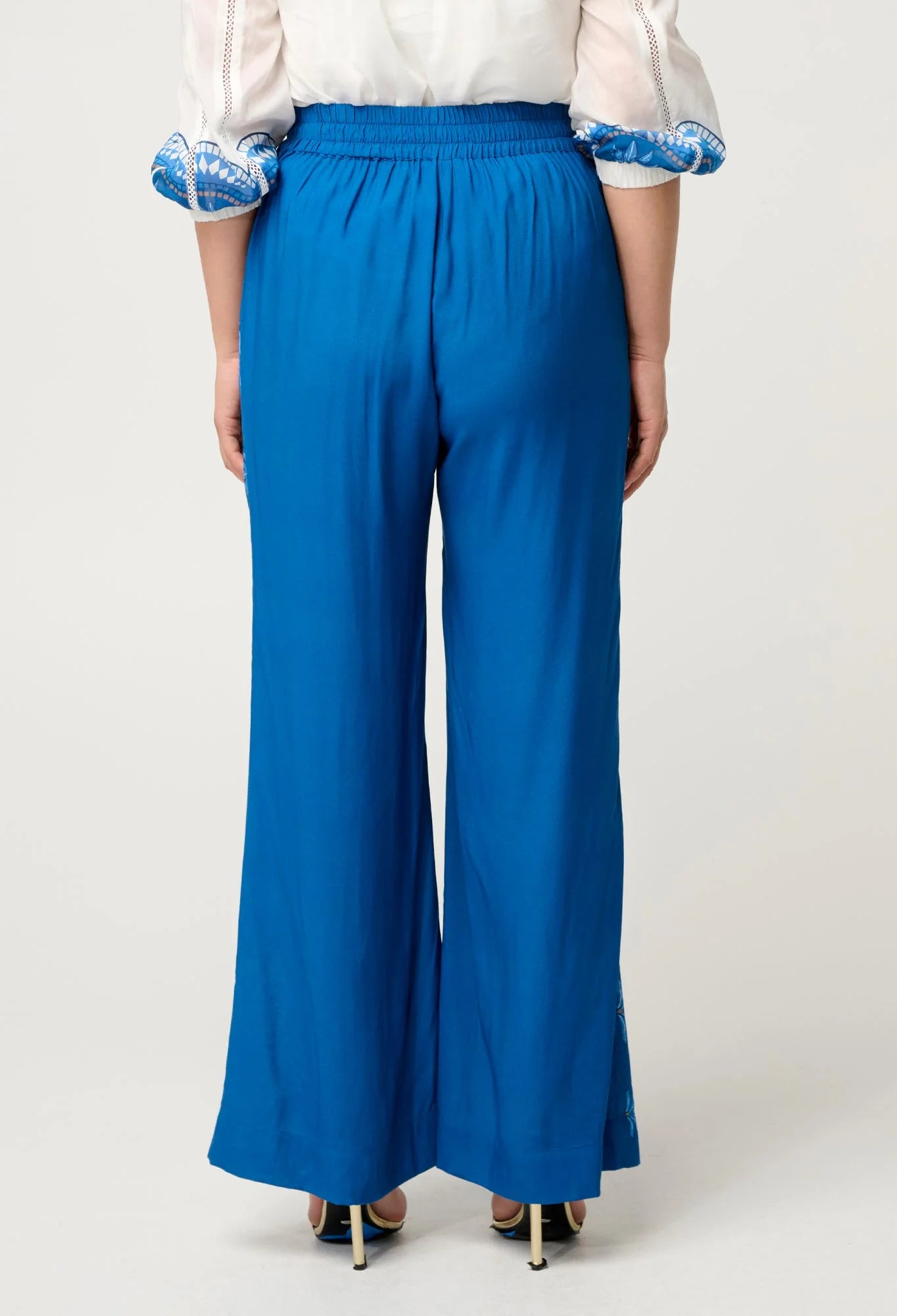 The vivid topaz blue hue is accented with contrasting embroidered scallop detailing along the side seams, creating a striking visual effect that elongates the legs. With a high-rise waist, sleek wide-leg silhouette, and functional side pockets, the Lilia Pant delivers both style and comfort. Perfect for special occasions, resort wear, or elevated everyday looks, these pants make a confident statement.