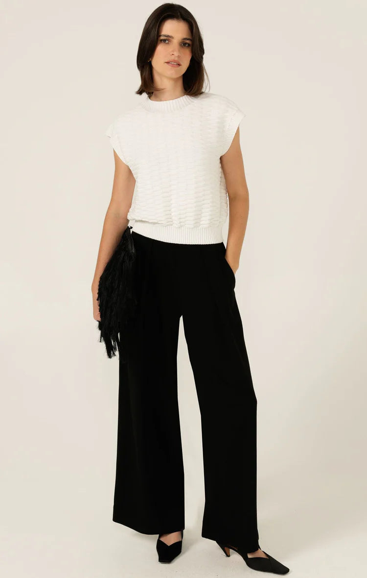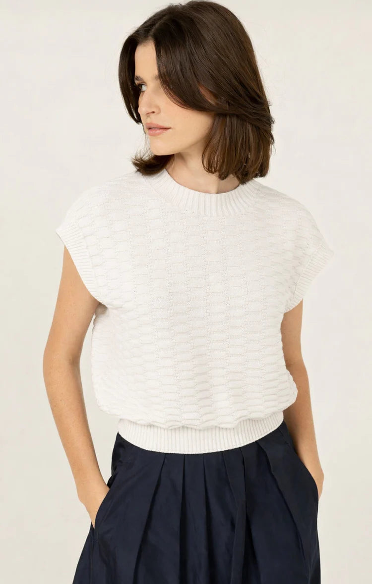 The Bubble Knit Top in Ivory by Sacha Drake is made from a soft cotton-blend fabric with stretch, featuring a textured bubble knit and a relaxed boxy silhouette. Finished with stretch rib at the waist and neckline, this easy pull-on style is the perfect layering piece for work and weekends.