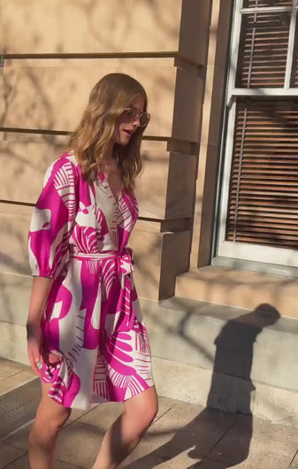 Made from lightweight viscose, the Flamingo Shift Dress by Sacha Drake features a relaxed A-line silhouette that can be worn loose or belted with the self-tie. Designed with bloused sleeves, side pockets, and an above-knee length, this versatile style is perfect for luncheons, races, and special events.