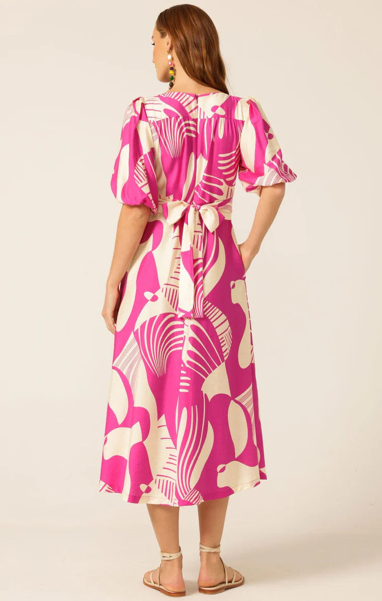 With its bloused sleeves, elasticated cuffs, gentle A-line midi silhouette, and invisible back zip, this piece is perfect for luncheons, races, and special events.