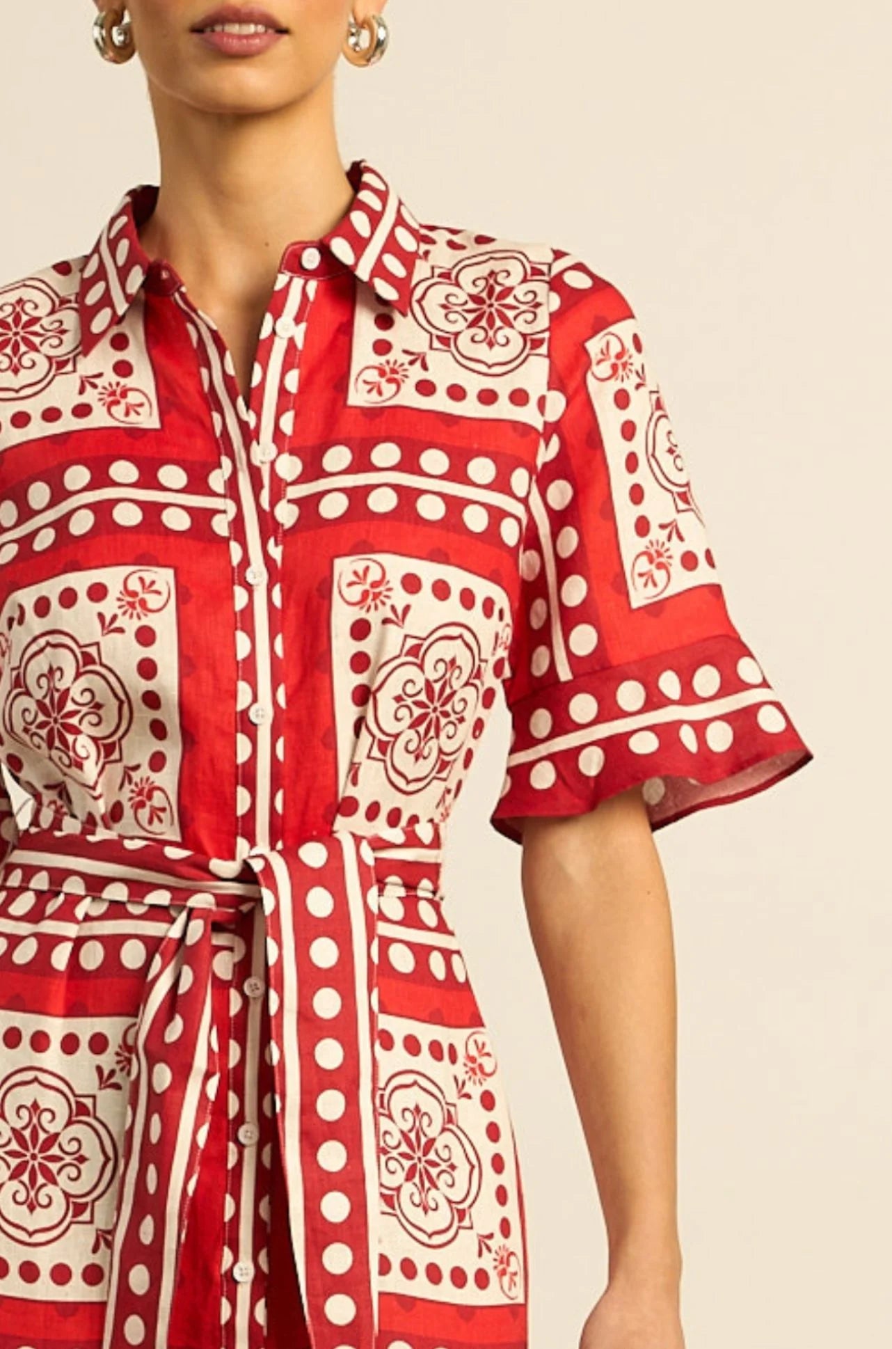 A self-tie belt and shell buttons running down the front allow for versatile styling options, making this piece the perfect travel companion.