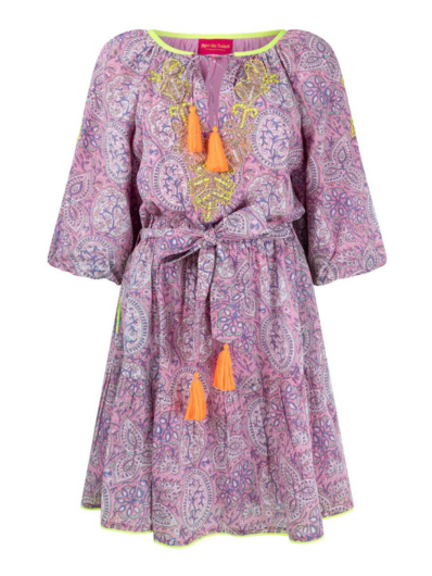 Introducing the S24-108 Dress by Place Du Soleil – a vibrant short dress featuring a purple-based paisley pattern and stunning embroidery.