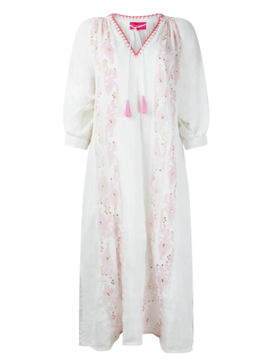 The hand-embroidered neckline, accented by tassels, adds an elegant touch, while delicate gold sequins provide a subtle shimmer. Fully lined for added comfort, this dress is the perfect balance of style and ease. A true wardrobe essential.