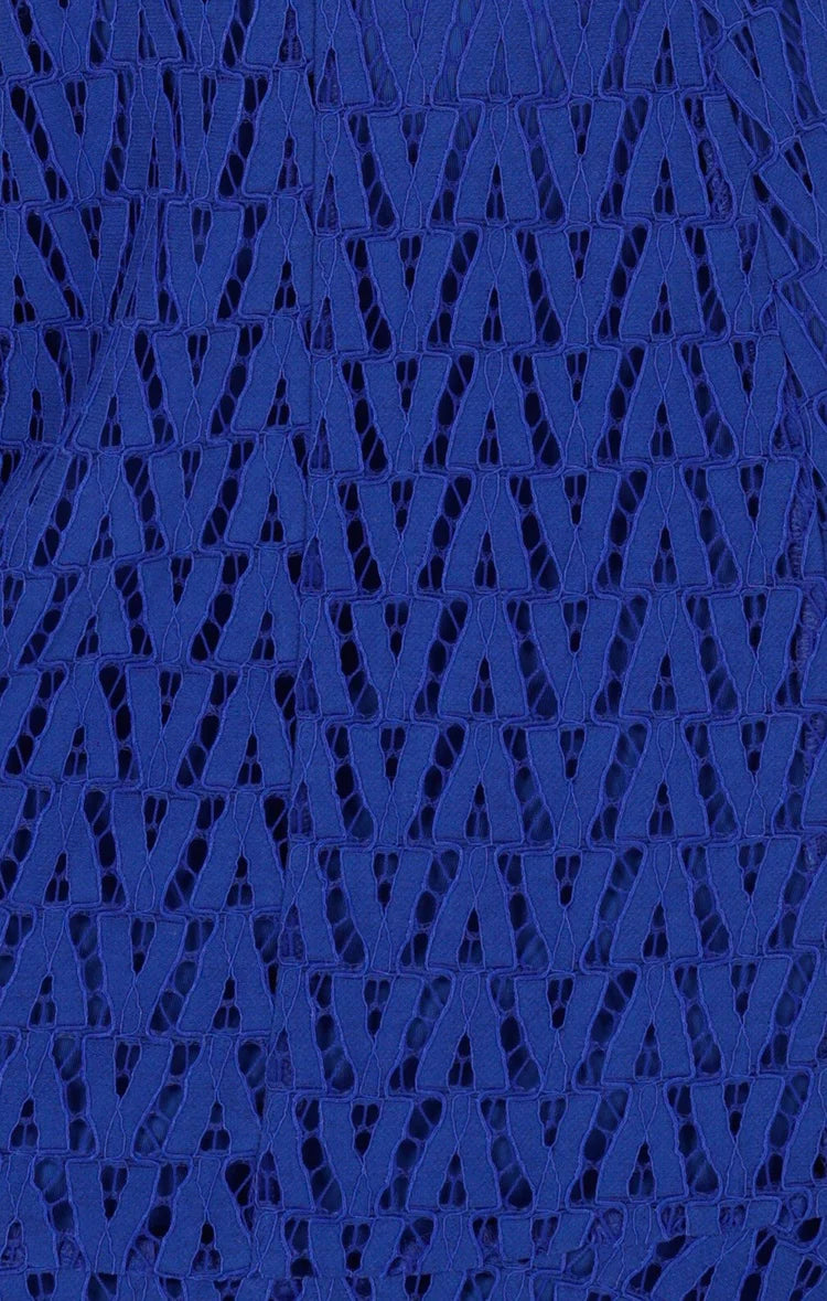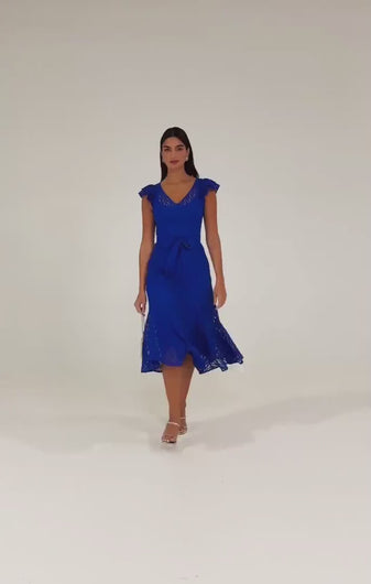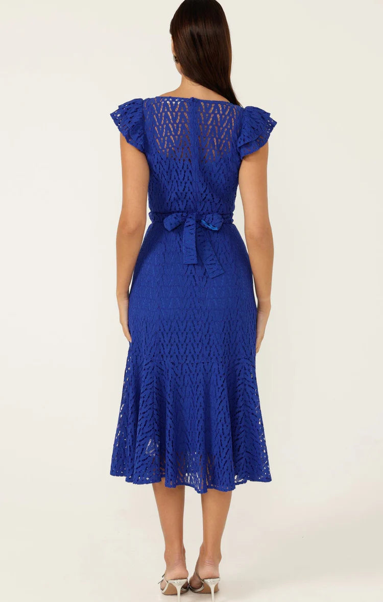 The Sienna Sunset Dress in Marine by Sacha Drake is made from a vibrant blue cotton-blend lace, featuring fluted ruffle sleeves and a romantic flounce skirt.