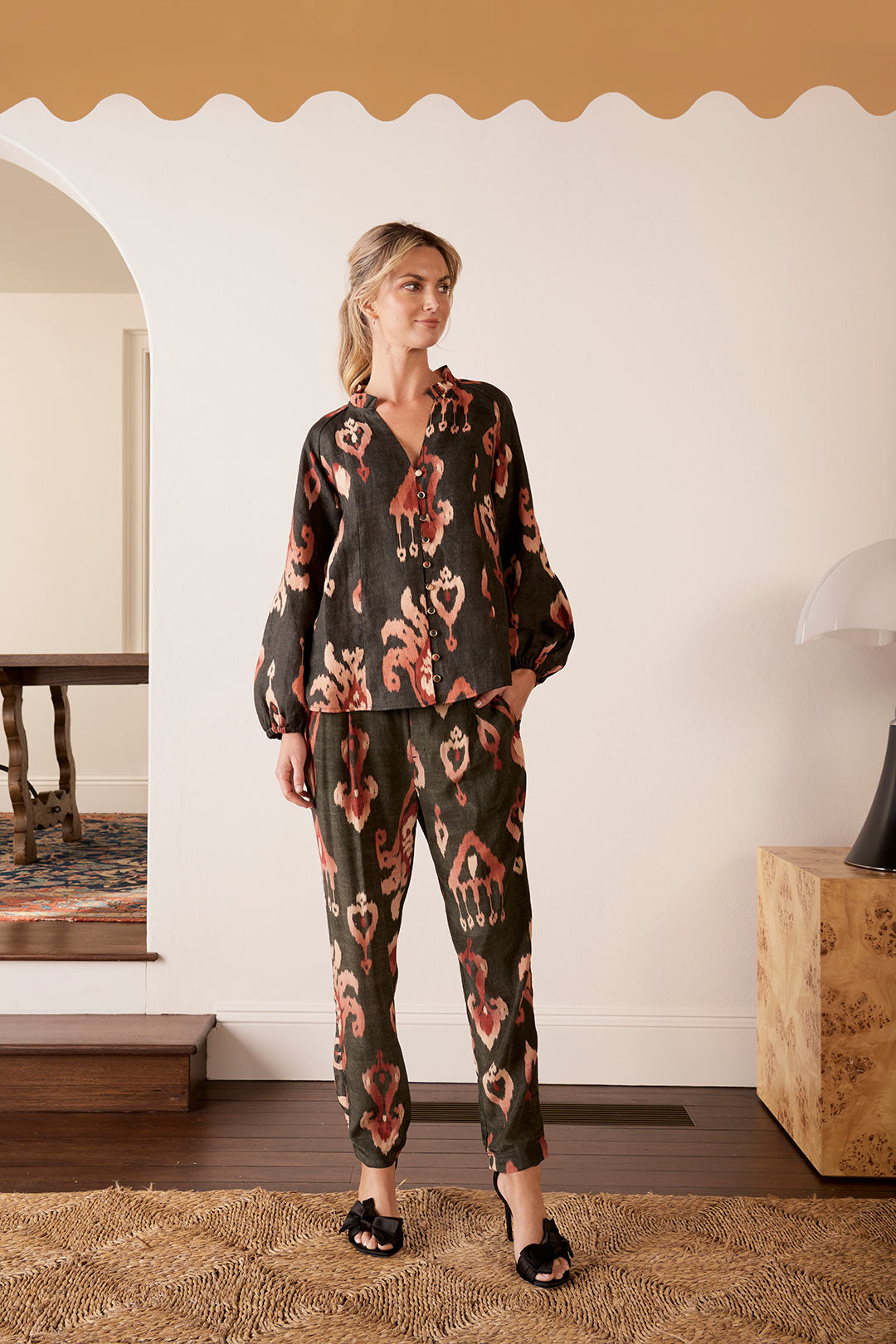 The Ayala Ikat Blouse by The Dreamer Label is a stylish and sustainable option for any wardrobe. This long-sleeved blouse is crafted from 100% hemp, making it both environmentally friendly and durable.