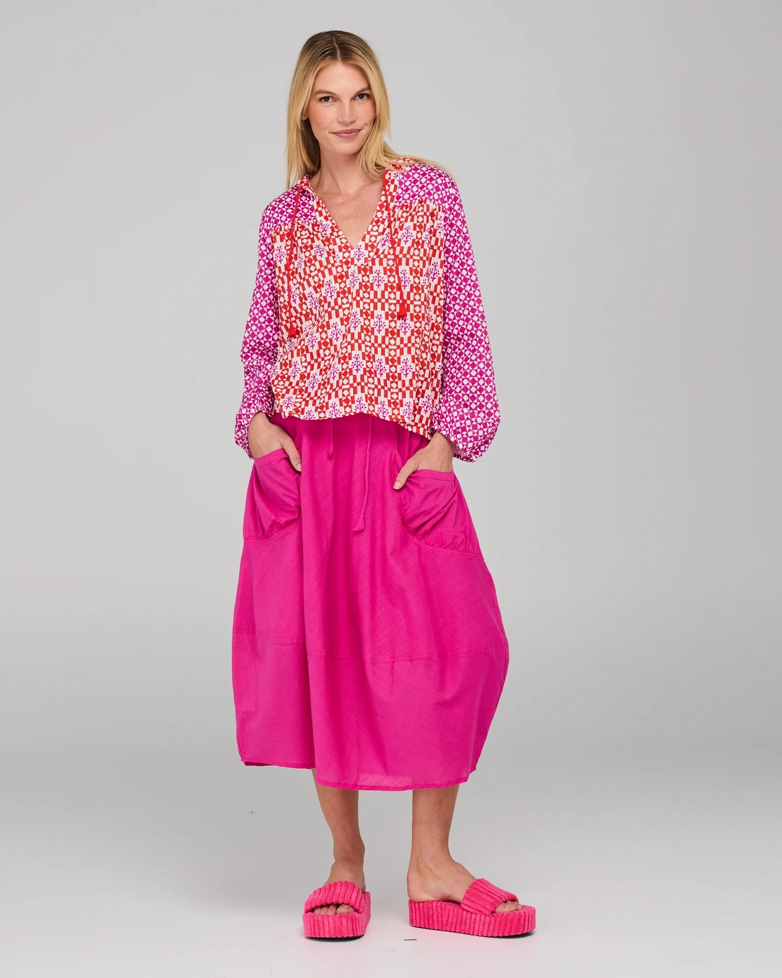 100% cotton, elastic sleeve opening, long sleeves, v-neckline with neck tie and all over unique spiced block print panels.
