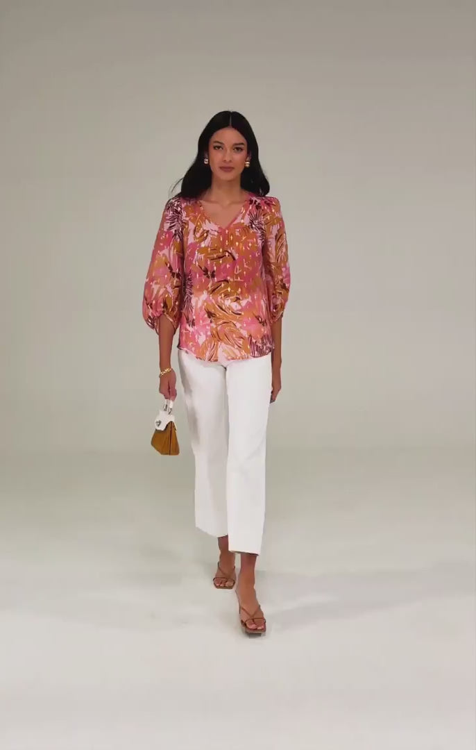 The Sunburst Blouse is made from luxurious cotton with gold foil detailing, featuring a relaxed fit with soft bloused sleeves and V-neckline. Designed with back gathers for ease, this easy pull-over style is perfect for weekends, holidays, events and work.