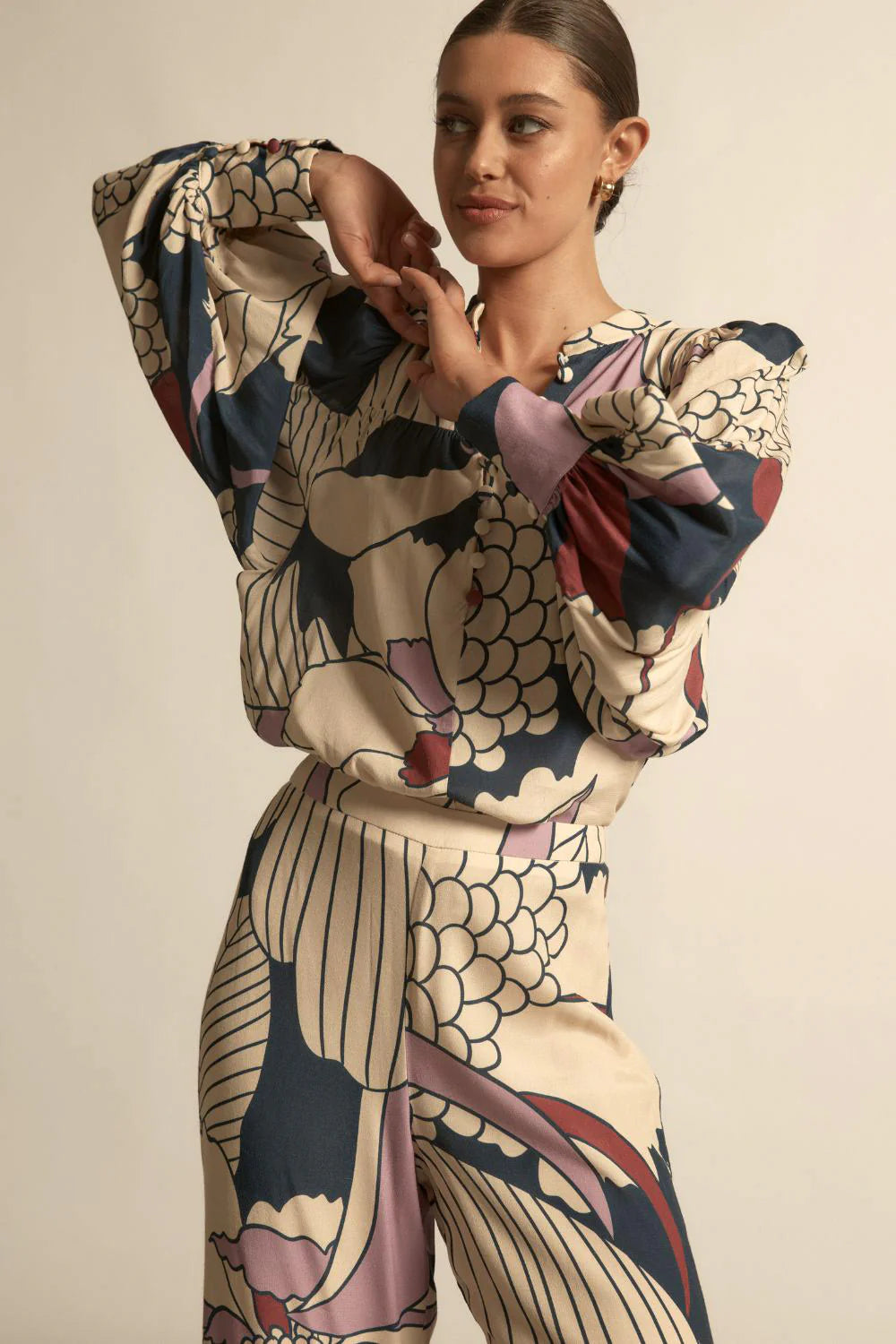 - blouson sleeves finished with a deep cuff for sculptural shape