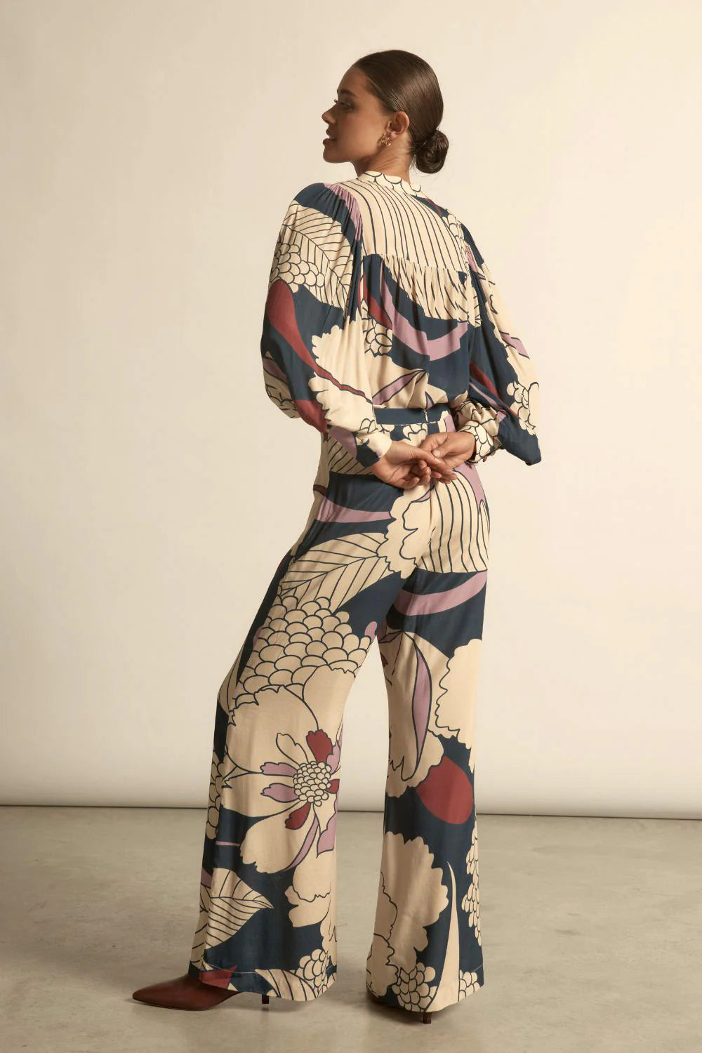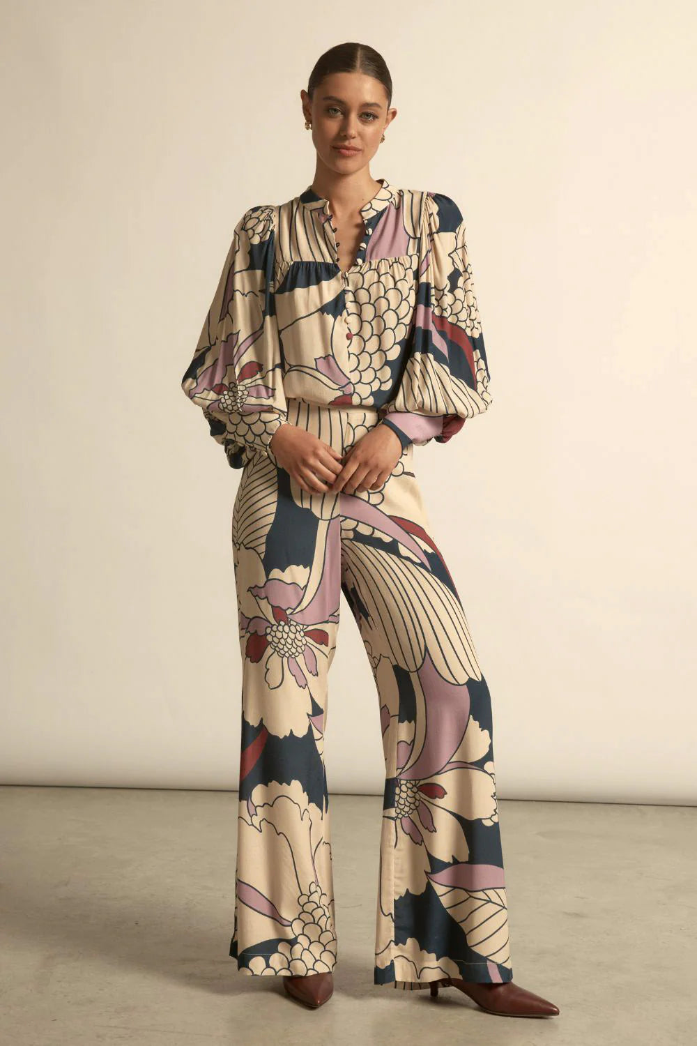 Oversized florals in muted neutrals and berry hues give Petal Reverie a statement look that remains refined.