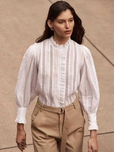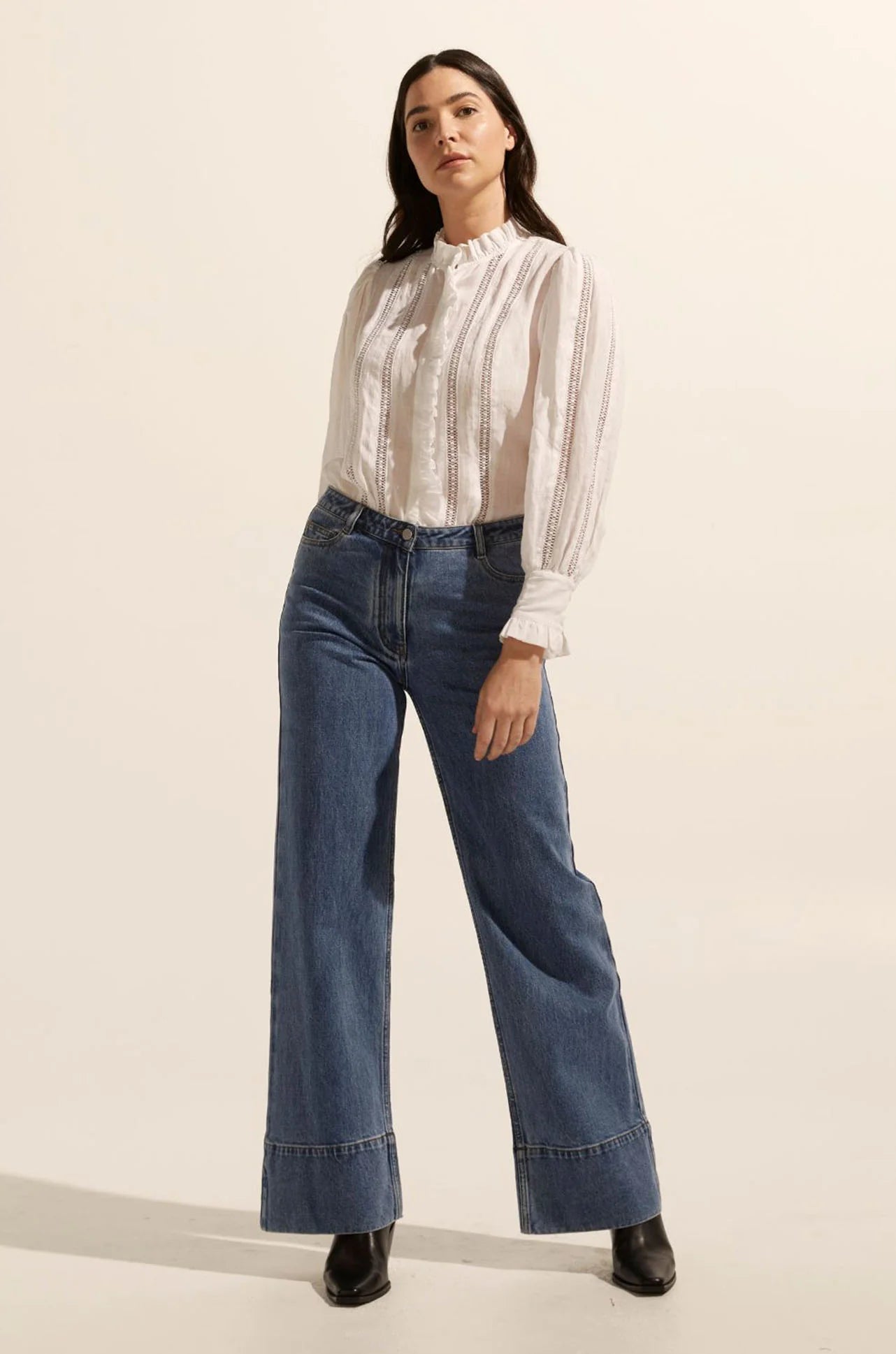 The Swoon Top in Porcelain by Zoe Kratzmann features a lovely ruffle neckline that adds a feminine touch, complemented by delicate lace detailing.