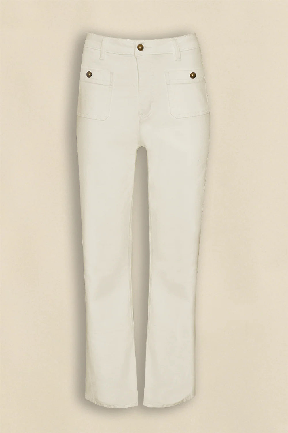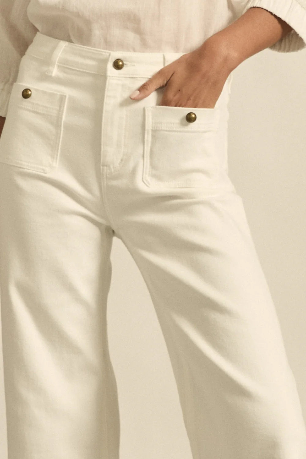 Curved front pockets finished with brass domed buttons add personality and flair, while a touch of elastane ensures a comfortable fit without compromising its structured silhouette.