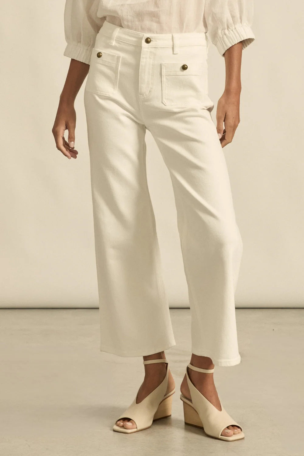 - Cropped wide-leg profile with a high-waisted fit